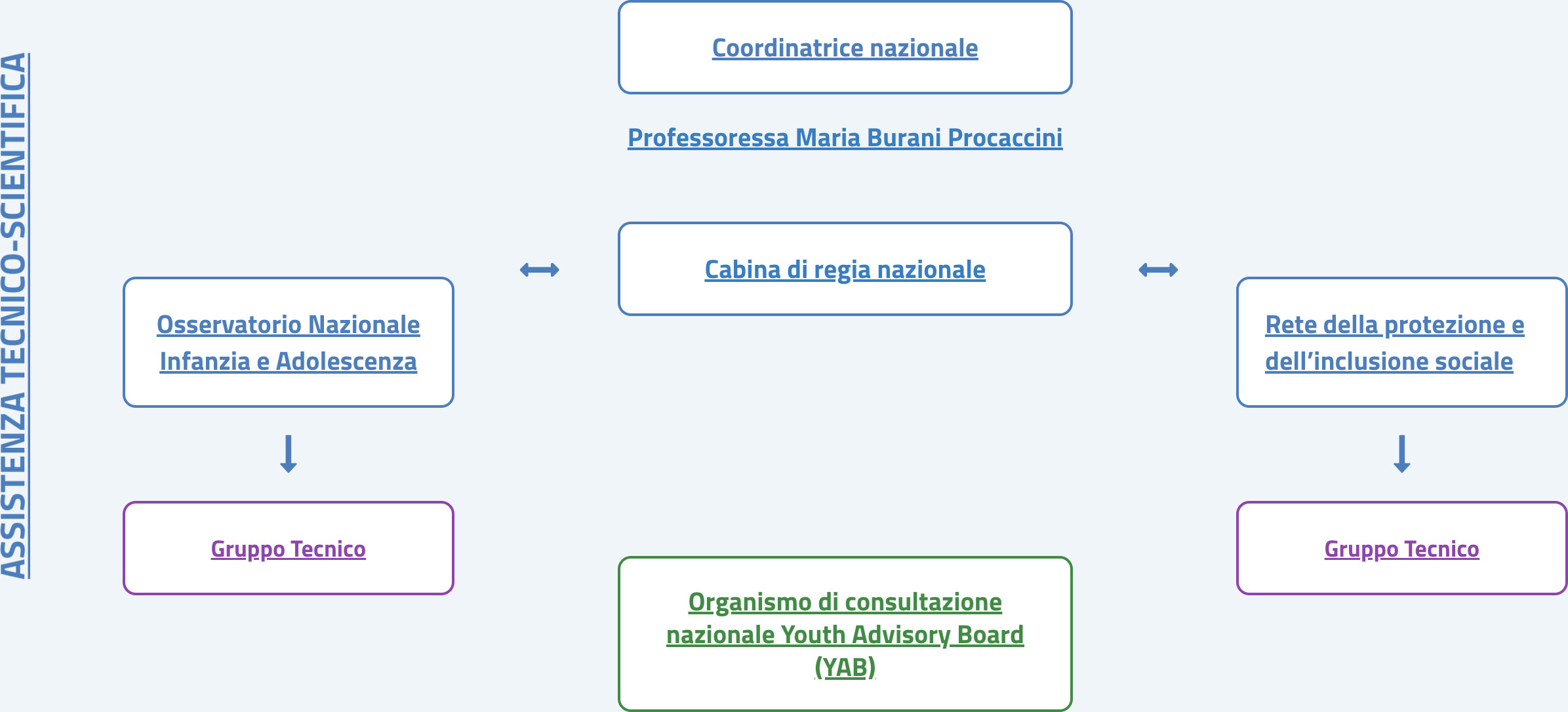 L’assistenza tecnica per il supporto al Coordinatore o Coordinatrice nazionale e per l’implementazione e il monitoraggio delle azioni del PANGI è garantita dall’Istituto degli Innocenti, attraverso azioni di supporto all’implementazione del piano nazionale, attività di disseminazione e informazione, raccolta e analisi di dati quali–quantitativi ai fini del monitoraggio e valutazione, supporto all’attuazione delle misure a livello decentrato, realizzazione di report tematici e manutenzione e aggiornamento del sito web dedicato.