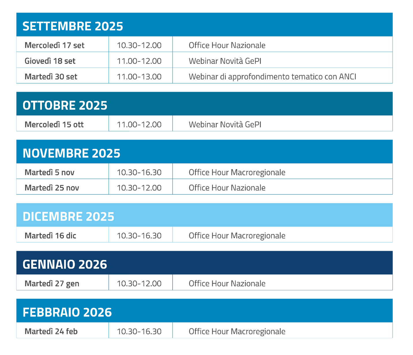 Anche i webinar novità GePI verranno calendarizzati tramite la piattaforma GePI, con modalità di iscrizione analoghe alle Office Hours. Questi webinar non saranno programmati anticipatamente, ma calendarizzati in prossimità del rilascio di nuove funzionalità in piattaforma e ne sarà data notizia su GePI in tempo utile