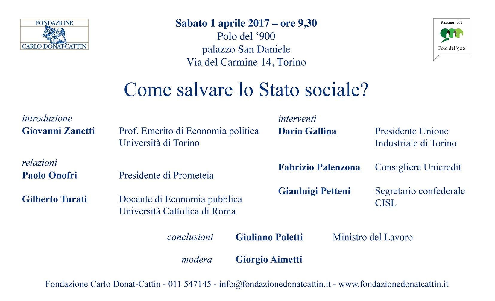 ​Si svolgerà sabato 1 aprile, in Palazzo San Daniele a Torino, il convegno “Come salvare lo Stato sociale?”, organizzato dalla Fondazione Carlo Donat-Cattin in collaborazione con Polo del '900.