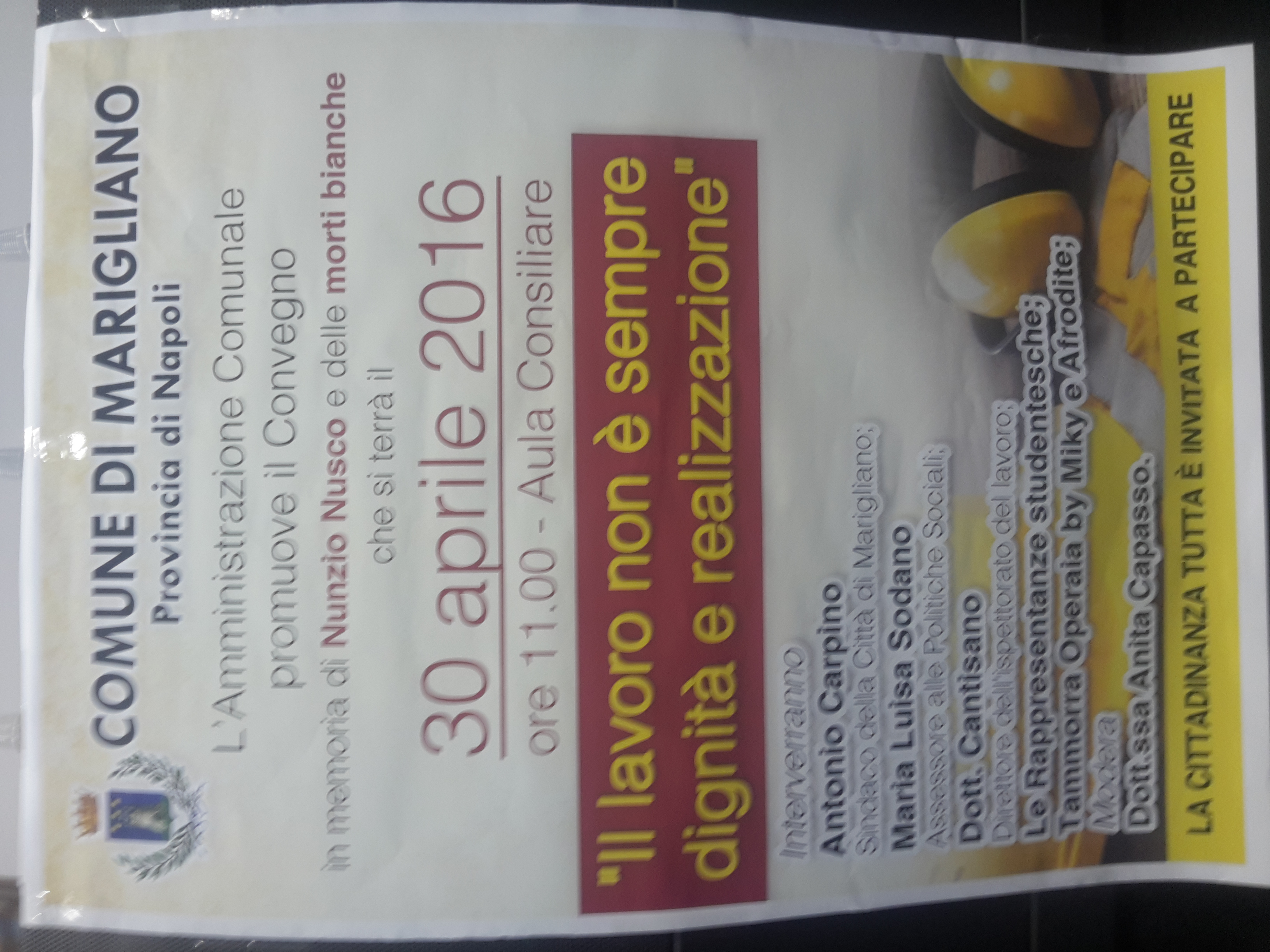 La Direzione Territoriale del Lavoro di Napoli comunica che, il Direttore dott. Giuseppe Cantisano, è intervenuto il 30 aprile 2016, presso l'Amministrazione Comunale di Marigliano (NA) al Convegno "Il lavoro non è sempre dignità e realizzazione" in occasione della Giornata in memoria di Nunzio Nusco e di tutte le "morti bianche".