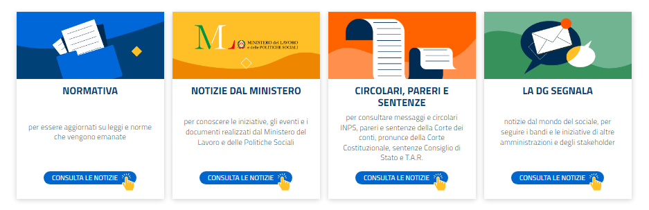 - Notizie dal Ministero: per conoscere le iniziative, gli eventi e i documenti realizzati dal Ministero del Lavoro e delle Politiche Sociali.